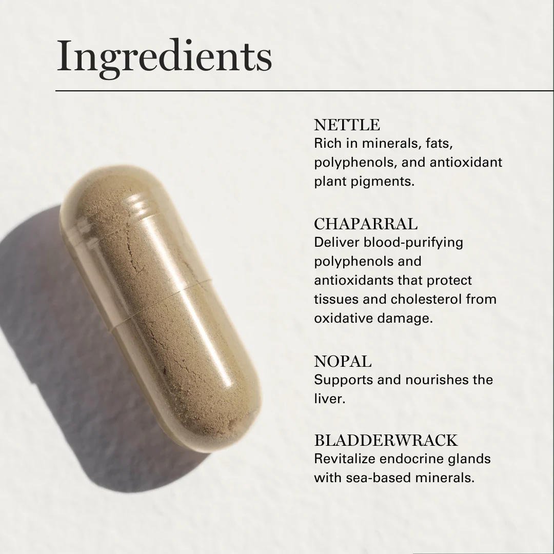 This intensely nutritious multi-mineral formula feeds your immune system, nervous system, and your gut. Densely packed with protective antioxidants, this chlorophyll-rich formula provides alkalinizing nutrition for your cells. Nettle is rich in minerals, fats, polyphenols, and antioxidant plant pigments. These help reduce chronic inflammation and help blood pressure balance. Chaparral and Blue Vervain deliver blood-purifying polyphenols and antioxidants that protect tissues and cholesterol from oxidative damage. Nopal supports and nourishes the liver, while Bladderwrack and Irish Sea Moss revitalize endocrine glands with sea-based minerals. Tila and Lily of the Valley actively nourish and stimulate the immune system.
